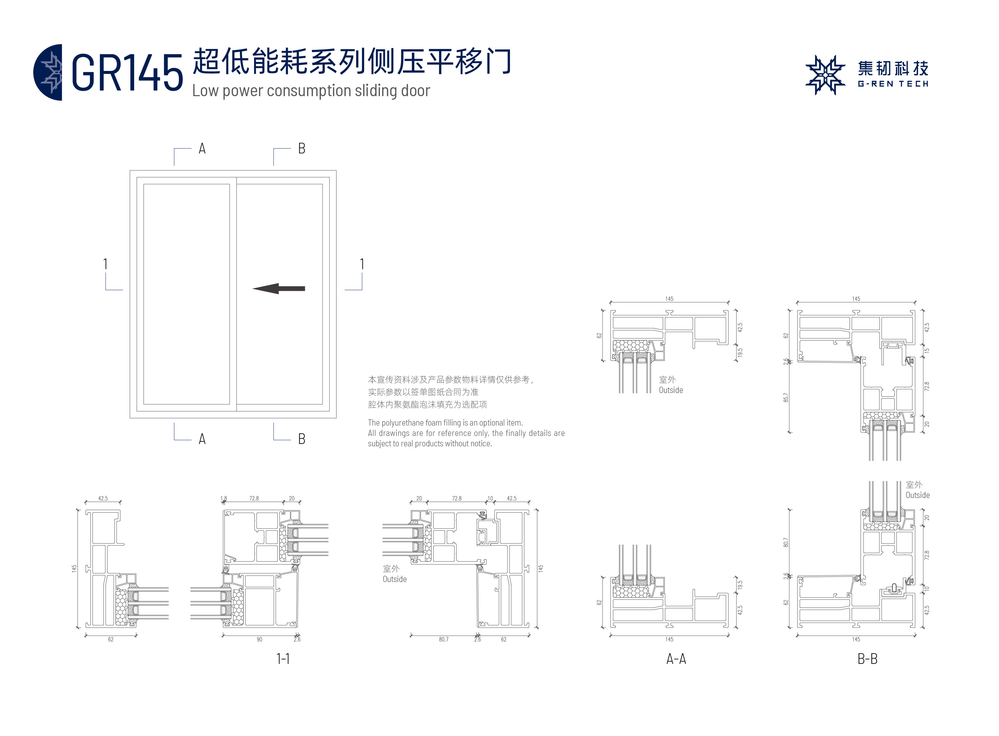GR145系列采用聚氨酯复合材料作为门窗型材,门窗各项性能优越,强度高,气密性、水密性、抗风压、隔声性能优异。所制成的145系列门窗密封性更好,推拉更轻松,开扇更大且不占用室内空间,外观平整、美观大方,安全性更高。