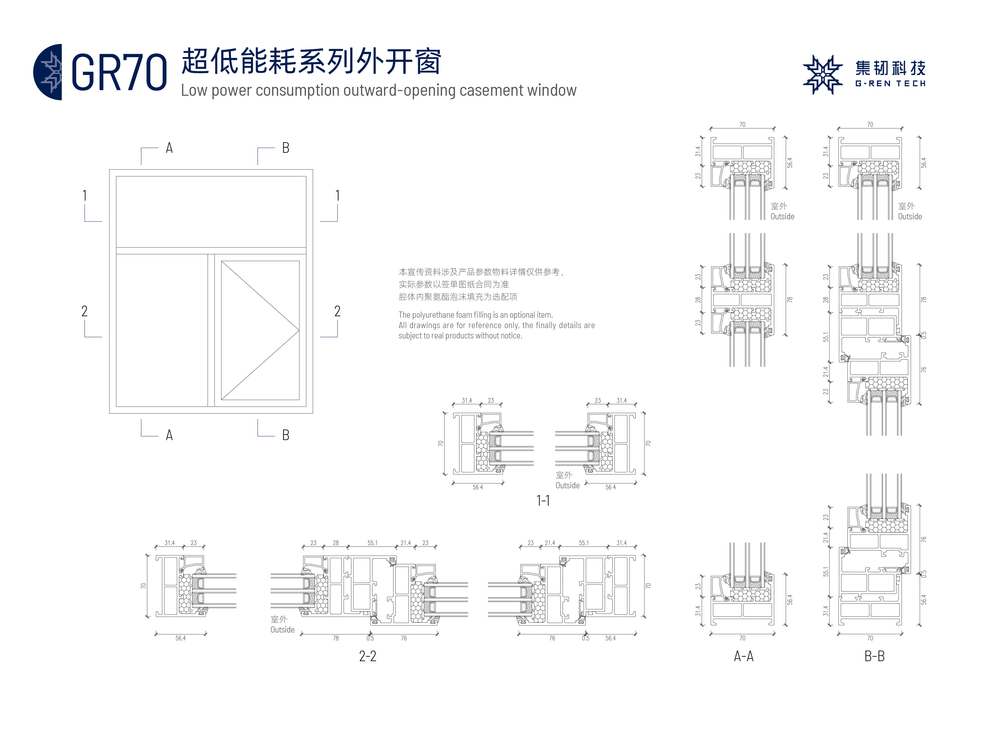 GR70系列采用玻纤增强聚氨酯复合材料作为门窗型材,该型材兼具保温与防火优势,耐火性能上佳,搭配各种防火玻璃,耐火完整性可做到1小时,并通过韩国室内外双面耐火检测,同时保温性能达到“一级”的门窗产品。