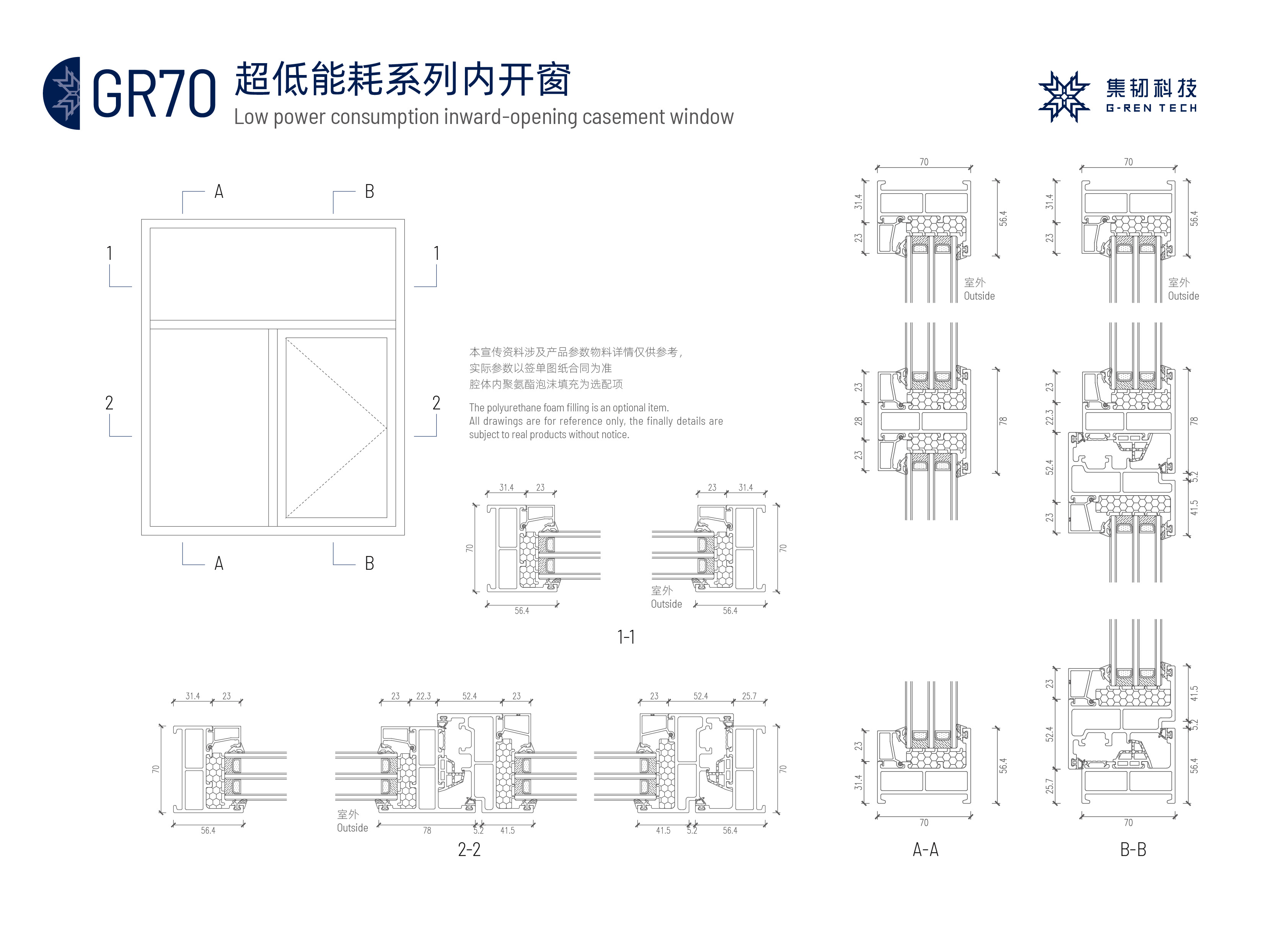 GR70系列采用玻纤增强聚氨酯复合材料作为门窗型材,该型材兼具保温与防火优势,耐火性能上佳,搭配各种防火玻璃,耐火完整性可做到1小时,并通过韩国室内外双面耐火检测,同时保温性能达到“一级”的门窗产品。