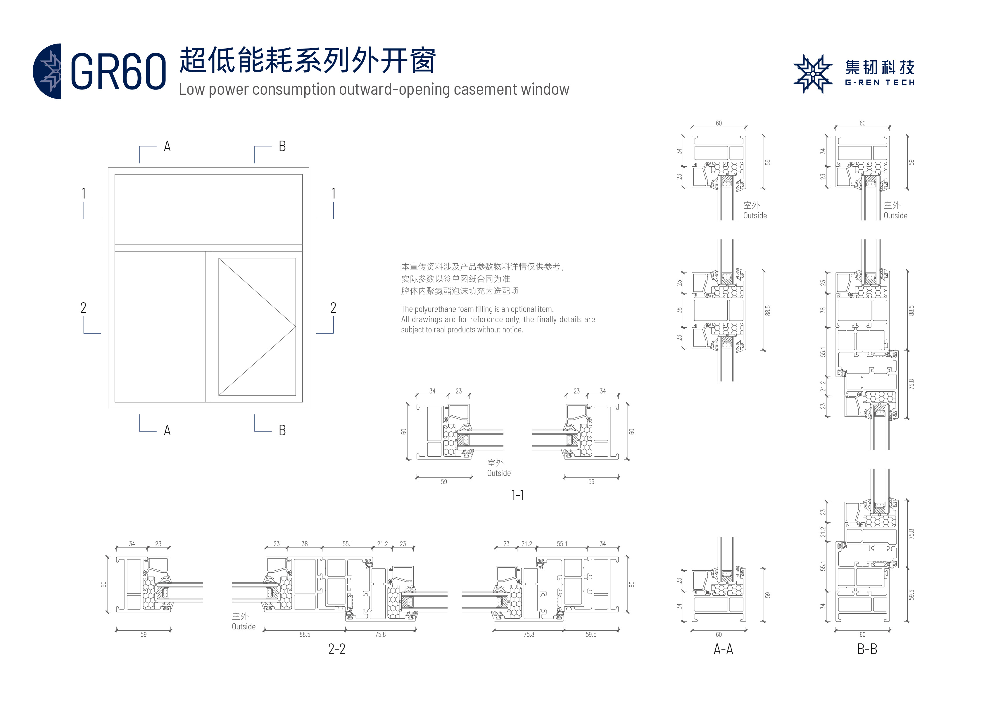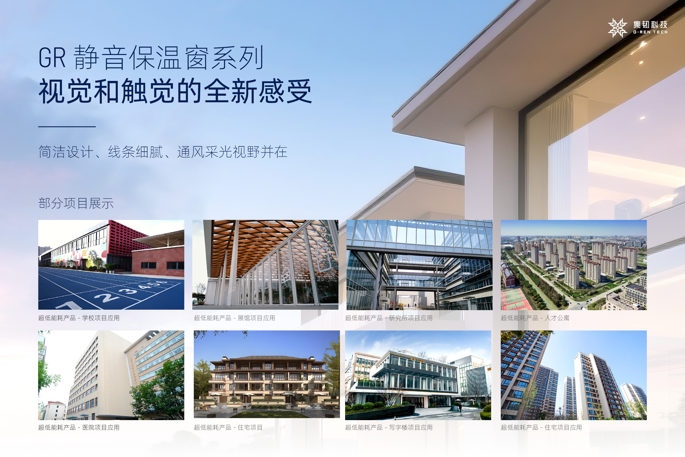 集韧科技GR60系列门窗产品,采用玻纤增强聚氨酯复合材料作为型材,型材的导热系数是铝合金的1/1300,导热系数只0.114(W/m·K)。所制成的门窗全部可达到国标高等级,真正做到了门窗“全断桥”。