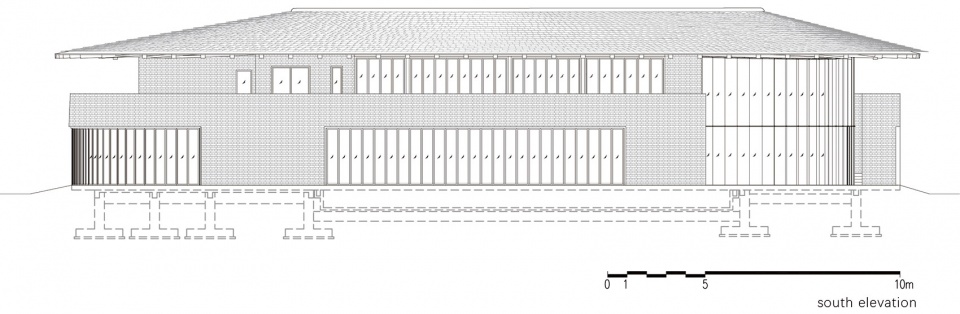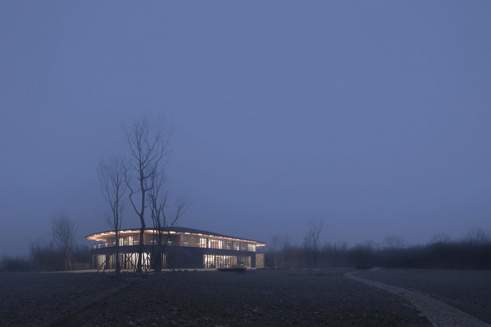 两层的天井式院落空间描绘了成都平原的未来闲适生活。底层布置了展示、接待、会议、交流和相应辅助功能,二层则主要为一系列不同大小的独立房间,可品茗,可抚琴,可用膳,可弈棋,与自然交融,与天地互动。沿外侧缓坡缓步而上,相对封闭的空间体验逐步被田野景观替代。随着日升月落,四季变化,景色不同,体验不同,这样的空间营造亦提供给观者一个体验自然的独特场所。另外,农耕辅助用房被设计成为带砖墙的覆土建筑,主要用于支持整个地景农耕劳作轮替的工具存放以及满足休息、餐食等辅助功能。