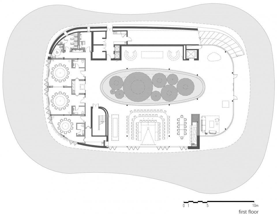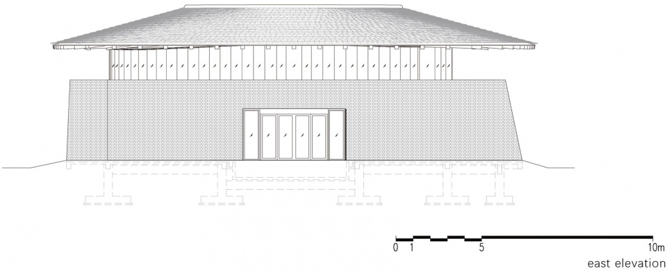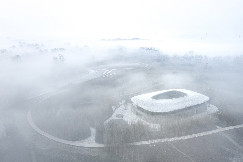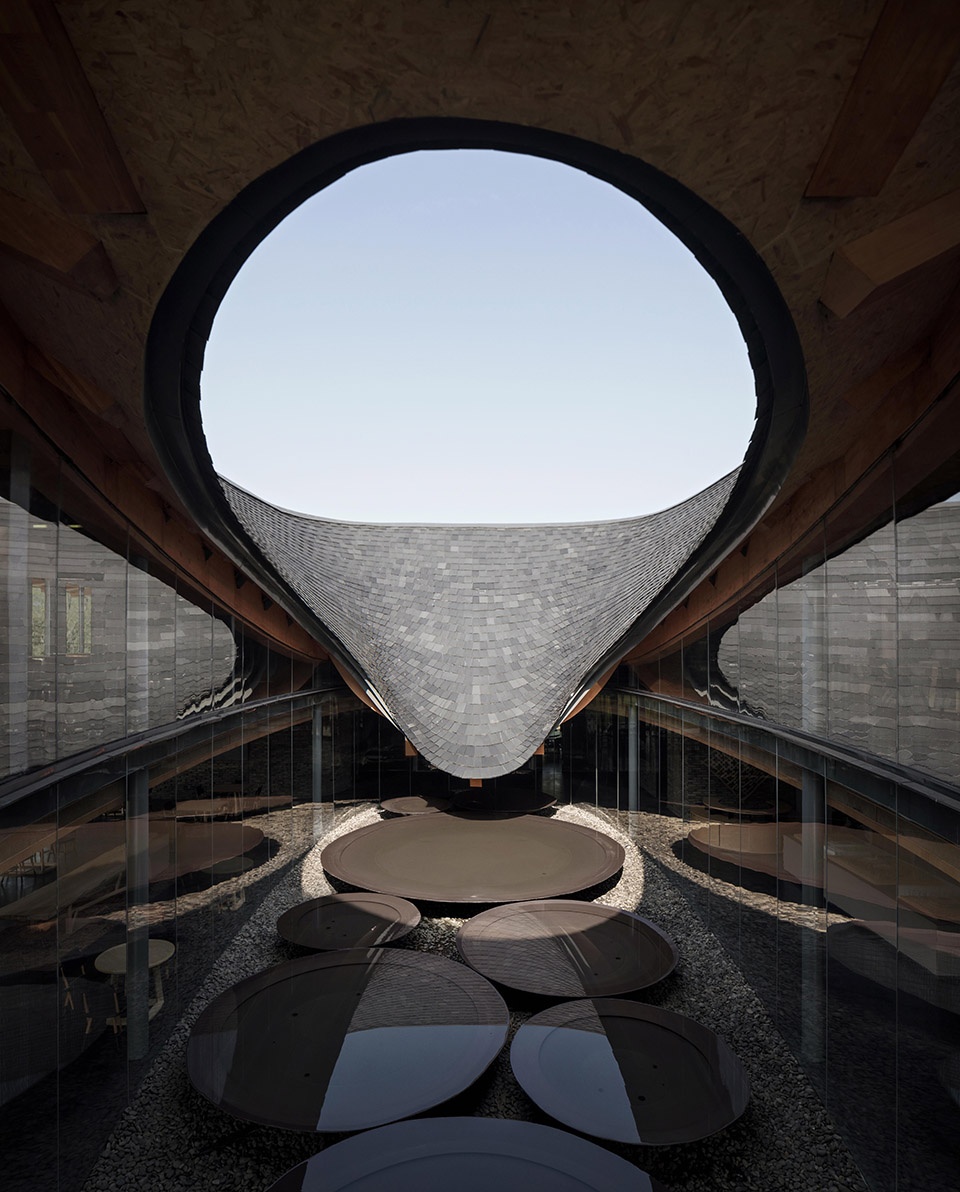 主体建筑设计概念源自于中国传统书法用的砚台。建筑整体轮廓平稳、端正,以此为基础,建筑重构了中国传统建筑基座与屋顶的意向:底层敦实稳定;屋顶飘逸灵动。但两者之间又相互融合,彼此对话,行成形与意之间的系列拓扑变形。屋顶通过向外大幅度的出挑,营造旷、远的空间姿态。同时,屋顶向内庭院一侧通过一条优雅的曲线下探,连接起天空与大地边界的柔、绵之意,重新思考在地的场所要素及其关系,使得中国传统建筑中的元素与当代最前沿的当代非线性审美产生了紧密的联系。这也是我们塑造生长着的林盘人居模式的初衷。