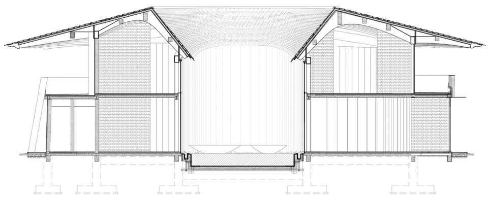 ▼屋顶向内庭院一侧通过一条优雅的曲线下探 ©苏圣亮